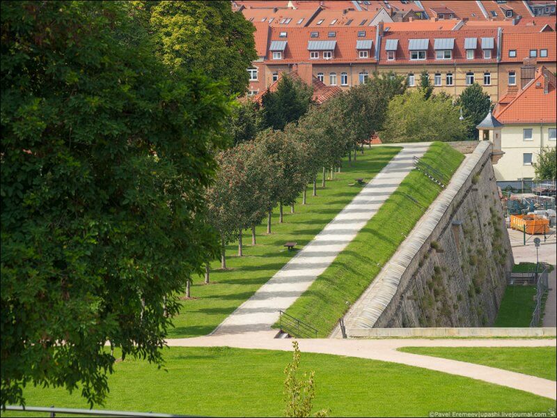 The Petersberg Citadel is a unique example of a medieval fortress. Firstly, it is in excellent condition. Secondly, it was built in a style that was atypical for Germany at the time: the facade is in the Baroque style, while the rest of the building is in the Romantic style.